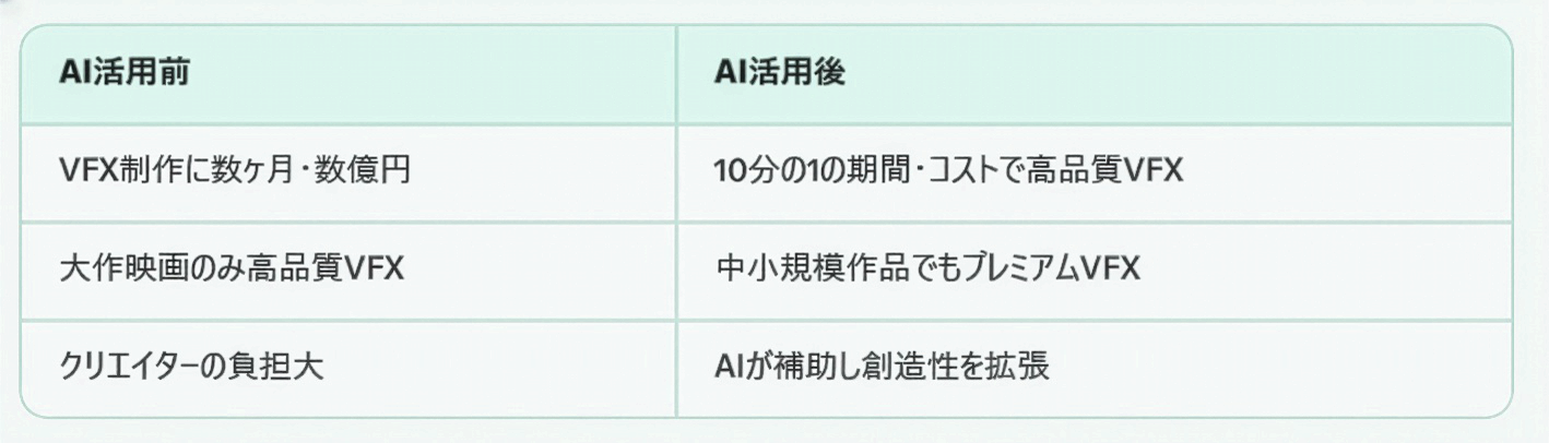 実際、Netflixは2025年のSFドラマ『The Eternaut』で生成AIをVFX制作に本格導入しました。従来なら巨額の予算が必要だった映像を、AI活用で「10分の1の時間とコスト」で実現。サランドスCEOも「AIはクリエイターの仕事を奪う存在ではなく、能力を拡張するパートナーだ」と語っています。