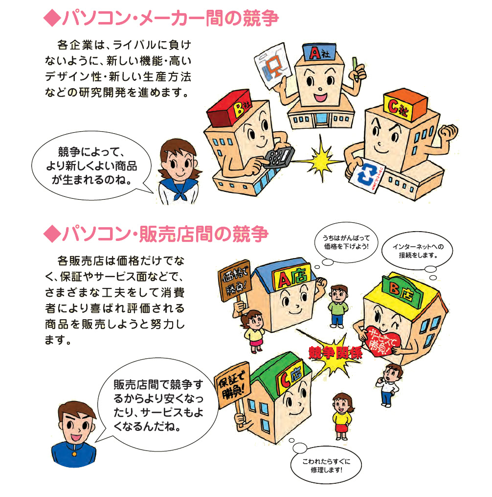 また、競争相手がいれば、消費者のニーズに応え相手よりも高性能を実現しようと研究開発に積極的に取り組まなければなりませんが、一社独占となると、開発努力のインセンティブも必要性もなくなり、旧式のパソコンをそのまま販売し続けることになります。このように、競争相手の存在が非常に大切ということですね。だからこそ、競争を守ることは非常に重要となってきます。