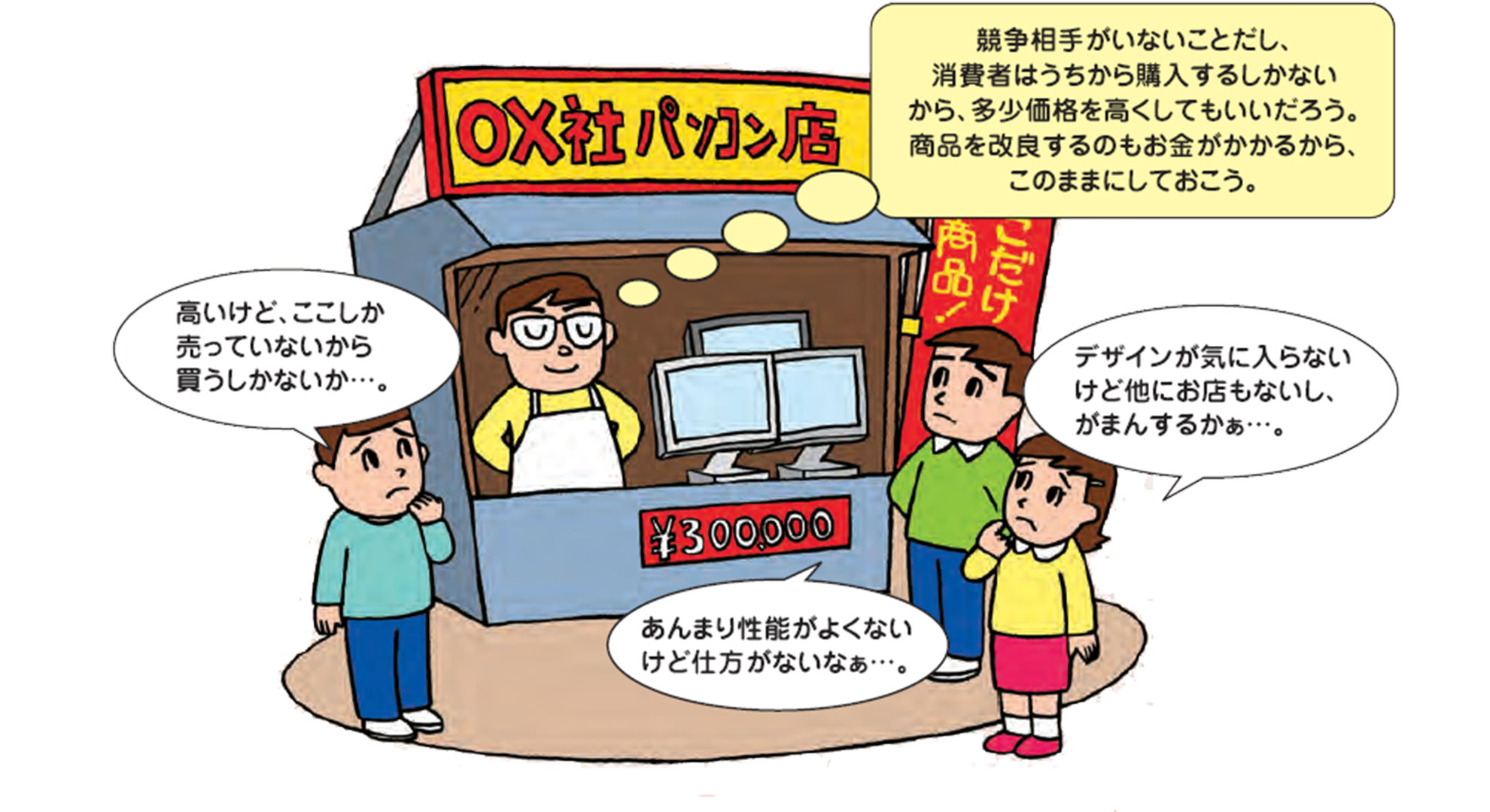 もし、パソコンを製造・販売する企業が一社のみとなったら、どのようなことが起きるでしょうか。競争相手がいれば、消費者に自身のパソコンを買ってもらえるよう相手よりも安く販売しようと努力をしなければなりませんが、一社独占となると、パソコンを必要とする消費者がいずれこの企業から買わざるをえないということになるので、価格を数倍高く設定することだってできるようになります。