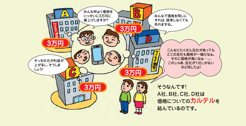 他方で、一社独占に至る状況でなくても競争を守る必要があります。例えば、企業同士らが多く儲かるために秘密裏に話し合ってみんなで一斉値上げを取り決めることもあります。このような互いに競争を回避する行動は違法行為であって「カルテル」と呼ばれます。カルテルによって、消費者がどこに行っても商品を安く購入することができなくなり、競争があるときと比べ、数倍の支出も余儀なくされます。