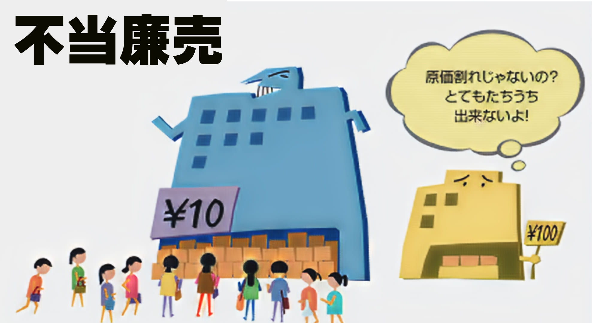 更に抱き合わせ販売や不当廉売といった不公正な取引方法も規制の対象となります。抱き合わせ販売は、高価値の必需品の購入を契機に、売り残った在庫品を一緒に買わせるために行われる行為です。不当廉売は、競争相手の経営を困難にし、排除しようとするために、意図的に製品を原価を著しく下回る価格で販売する行為を指します。