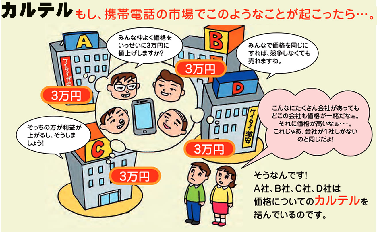 次にカルテルと呼ばれる違反行為についてご紹介します。カルテルとは、本来競争し合う関係にある企業同士が、競争を回避するために販売価格や販売地域などを秘密裏に話し合い、決める行為を指します。カルテルが形成されると、価格競争が排除され、消費者は通常安価に購入できる商品を高い価格で購入せざるをえなくなります。例えば、次のイラストで示されているような行為です。