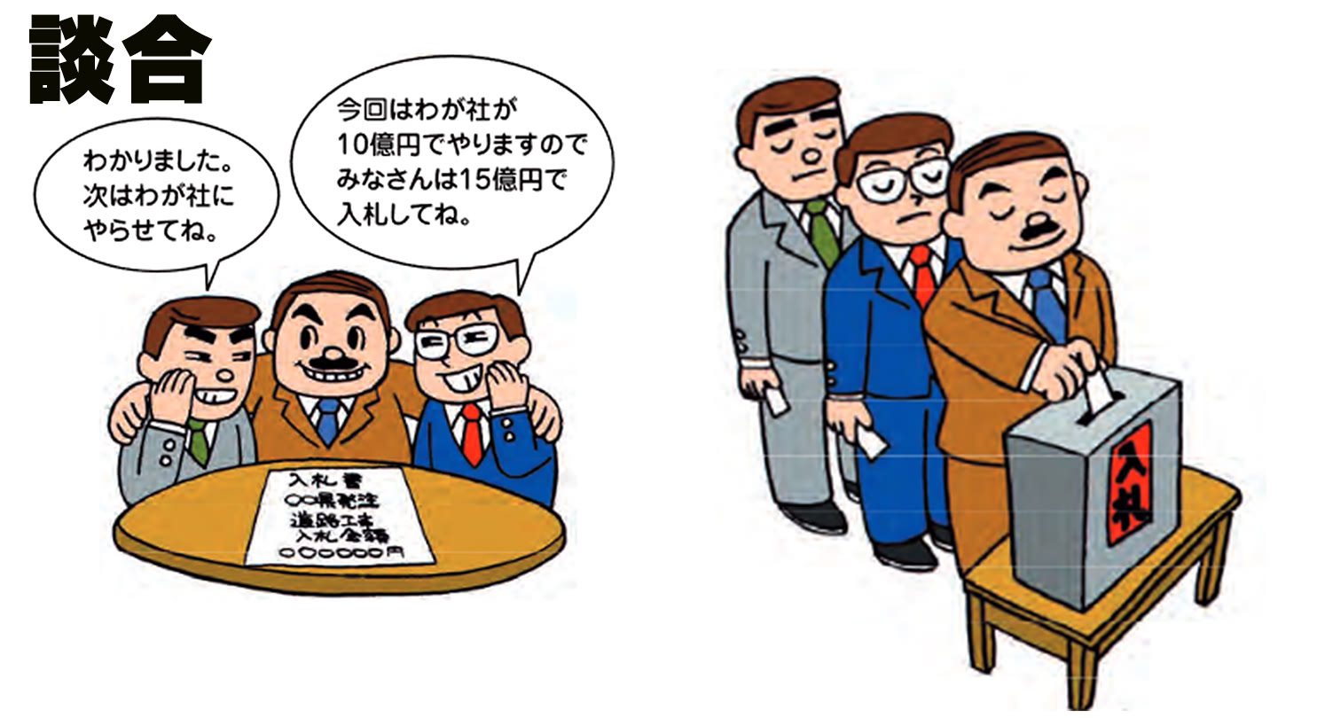 前記のカルテルと似たような行為として、入札談合という違法行為もあります。建設工事等の入札において、本来入札価格を競争する関係に複数の企業が秘密裏に受注価格と落札者を、話し合って決めるというような行為です。競争があれば、通常安く済んだであろう工事費も、膨らむことになります。