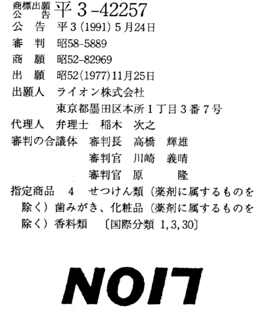 例えば、よく知られているライオン株式会社が、「LION」(商標登録番号第545999号)を180度反転させると「NO17」と読めることから、類似商品や偽物の商品が出回ることを防ぐ目的として、「LION」の上下を反転させた「NO17」という商標も登録しています(商標登録番号2419294号)。
