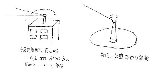 一方、各地の高層建築物及び公園、施設などから水平及び斜め上方へレーザーを回転させることにより防衛する。」