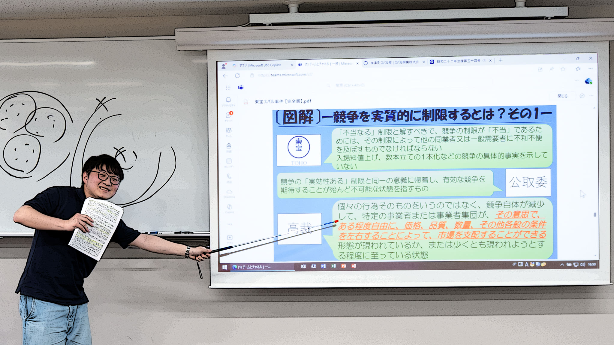 今週の審判決プレゼン〔映画興行市場における競争制限をめぐる訴訟〕 2025年5月16日(金)のゼミナールでは、映画劇場による業務連携が興行市場の競争を実質的に制限したとして争われた訴訟事例を題材に、プレゼンテーションと討論を行いました。 (東京高判昭和26年9月19日)