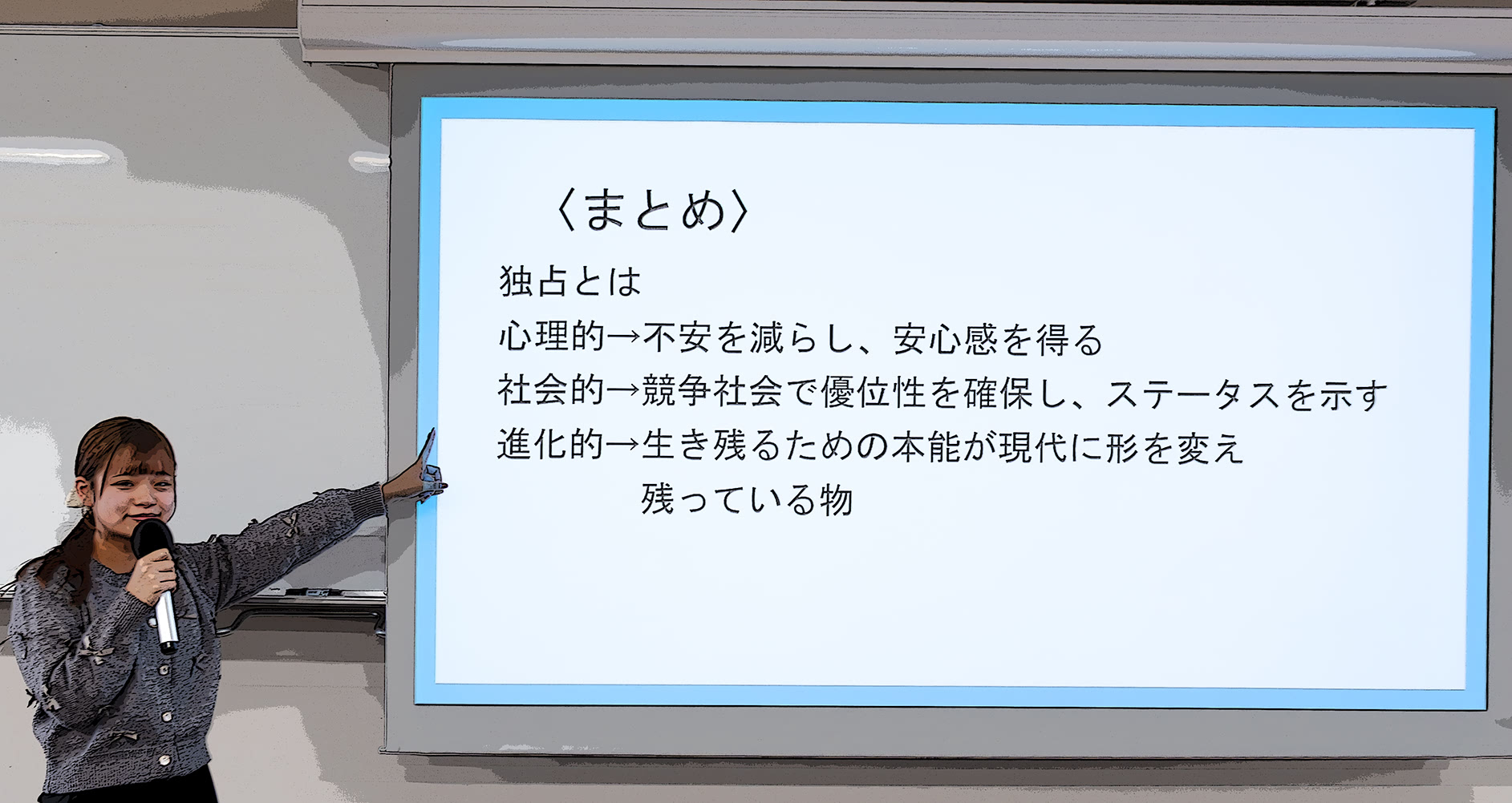 今週の経済心理学プレゼン〔人はなぜ“独占欲”を持つのか〕 2025年12月5日(金)のゼミナールでは、独占禁止法で規制される違法な独占行為を念頭に、事業者はなぜ競争者を排除し市場を独占しようとするのかについて、経済心理学の視点からプレゼンテーションと討論を行いました。
