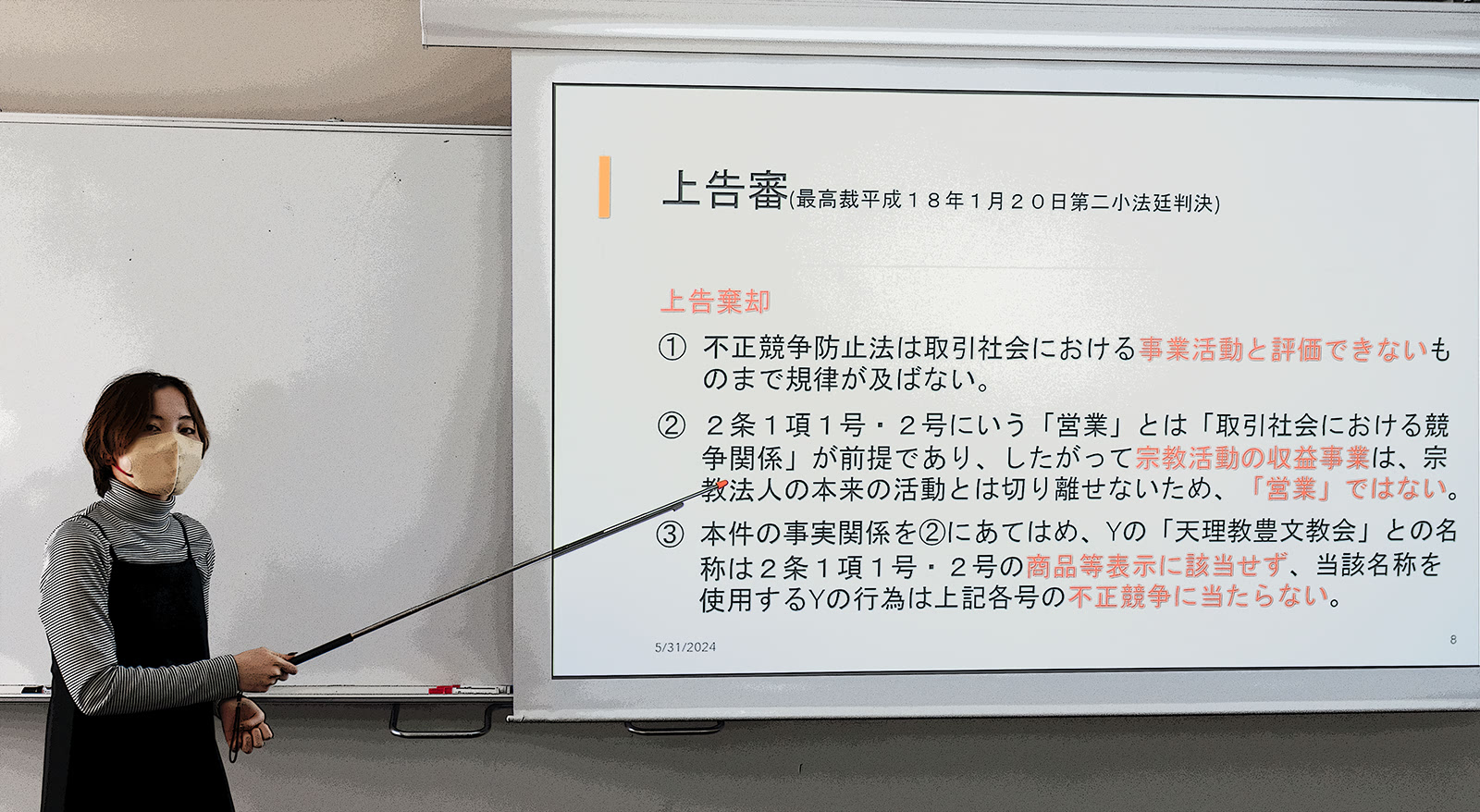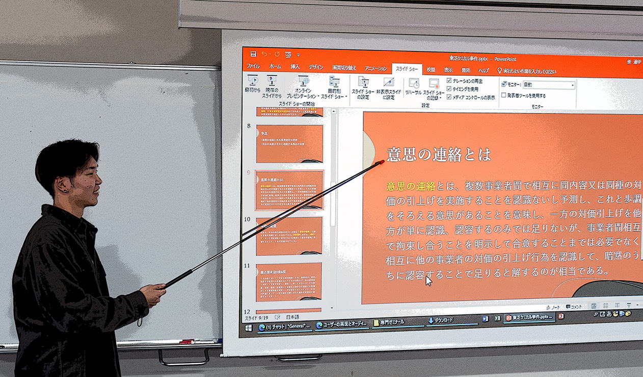 今週の審判決プレゼン〔宗教活動も営業行為に含まれるか等を巡る訴訟〕 2024年5月31日のゼミナールでは、宗教活動と営業行為、商品形態の法的保護及び価格カルテルにおける意思の連絡等を巡る3つの訴訟事件について、プレゼンテーションと議論が行われました。 (最高裁平成18年1月20日) (知財高裁令和1年8月29日) (東京高判平成7年9月25日)