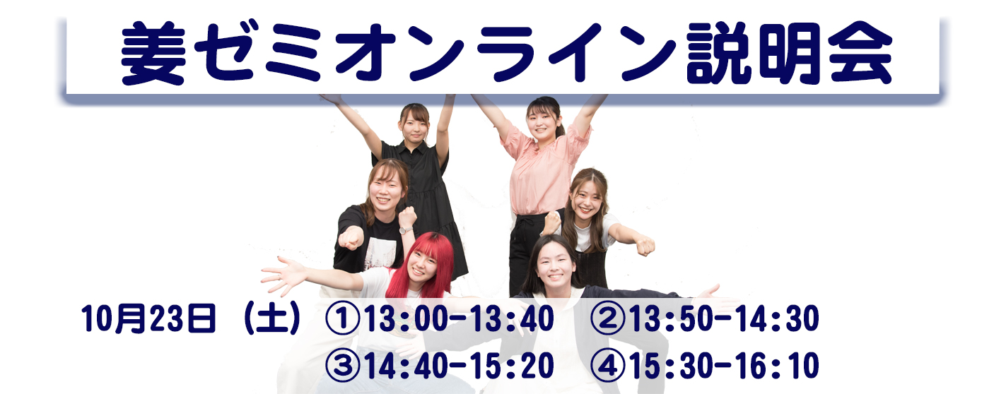 10月23日(土)に次のZoomルームにてオンラインゼミ説明会を開催します。1年生の皆さんと距離がとても近い姜ゼミ2年生の先輩達が、姜ゼミのことを色々ご紹介します。