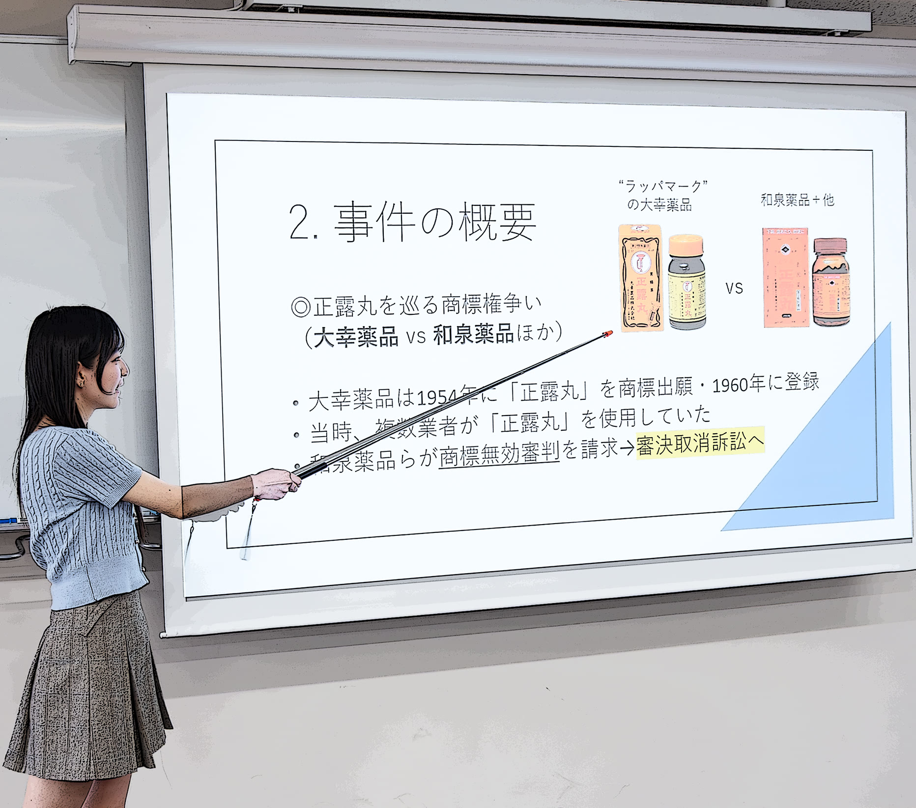 今週の審判決プレゼン〔商標権の効力等を巡る不正競争防止法・商標法の関係訴訟〕 2025年6月13日(金)のゼミナール前半では、陳列デザインに関する不正競争防止法訴訟と、商標権の効力をめぐる不正競争防止法・商標法の関係訴訟をテーマに、それぞれプレゼンテーションと討論を行いました。 (大阪地判平成22年12月16日) (大阪高判平成19年10月11日)